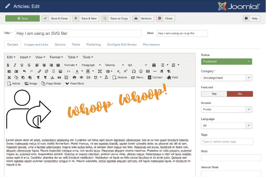 So here is a workaround on using svgs on Joomla. (Obviously only use your own files where you know you’ve not added extra code that may compromise your site. )